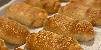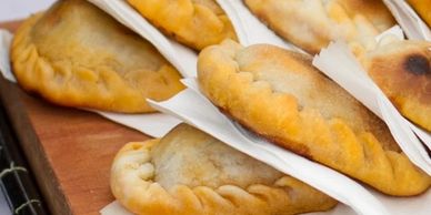 Oven fresh cooked pastry, filled with meat (of your choice) carrots, potato tidbits, peas, corn, paprika and raisins .